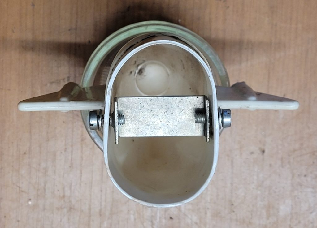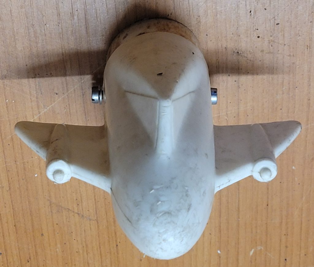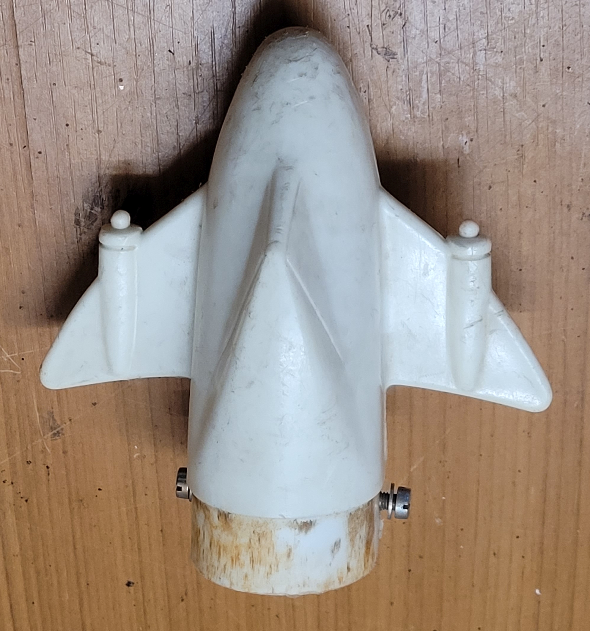 Kopf für Raketenfahrzeug Hersteller:unbekannt Abmessung:L 11 cm, B 14 cm, Aufnahme 6 x 4 cm Sonstiges:GFK, lackiert Preis:25 €
