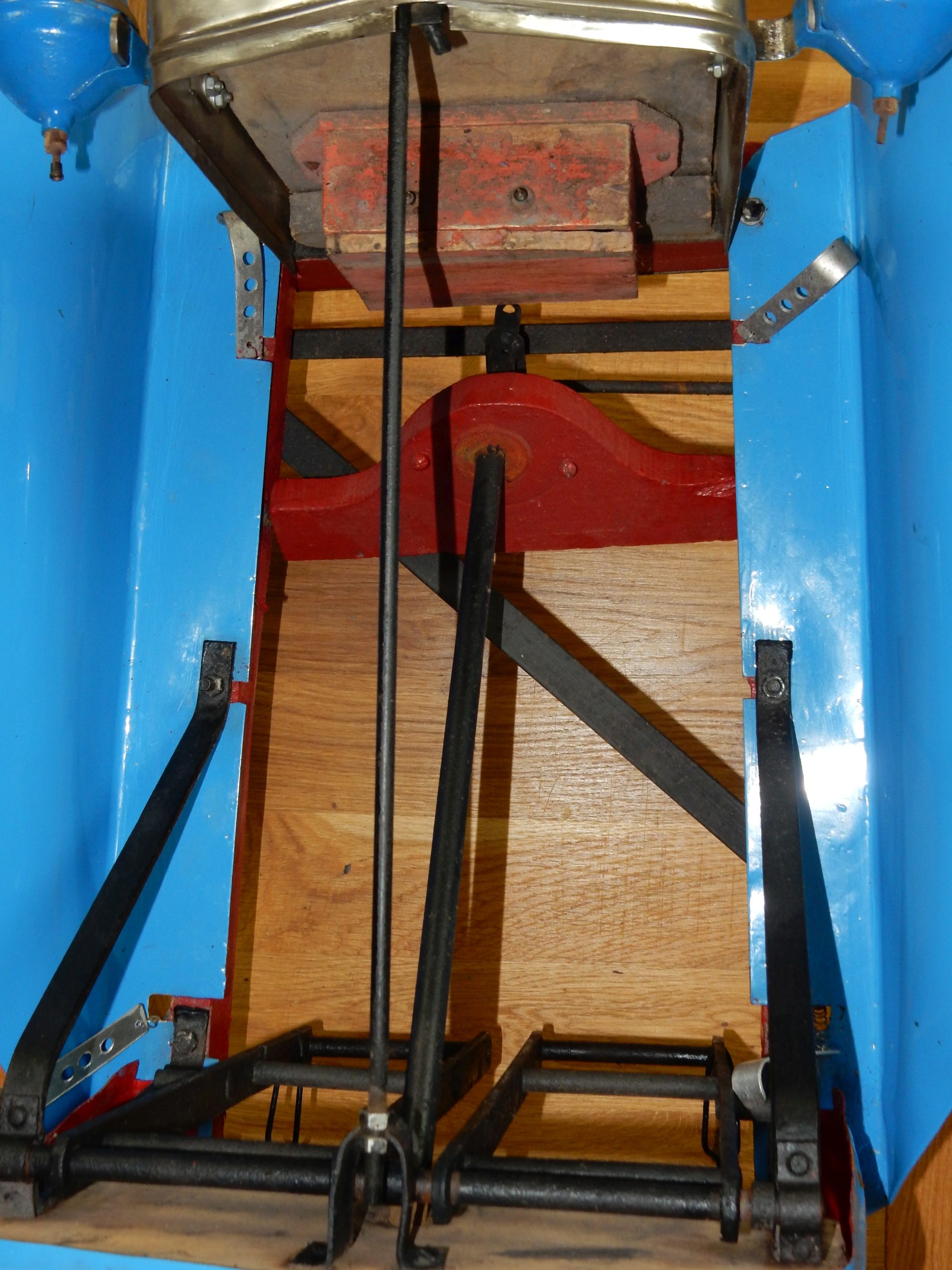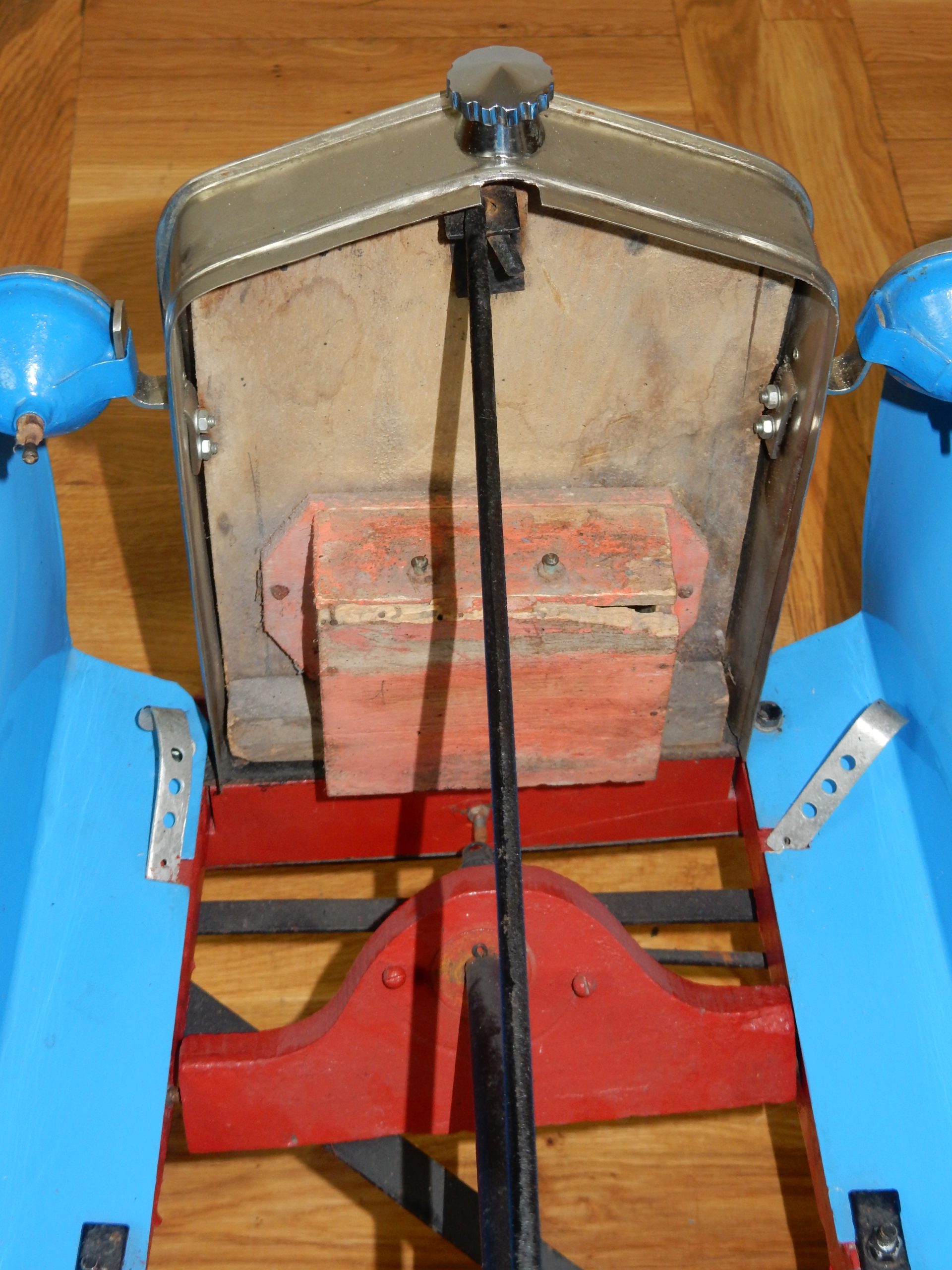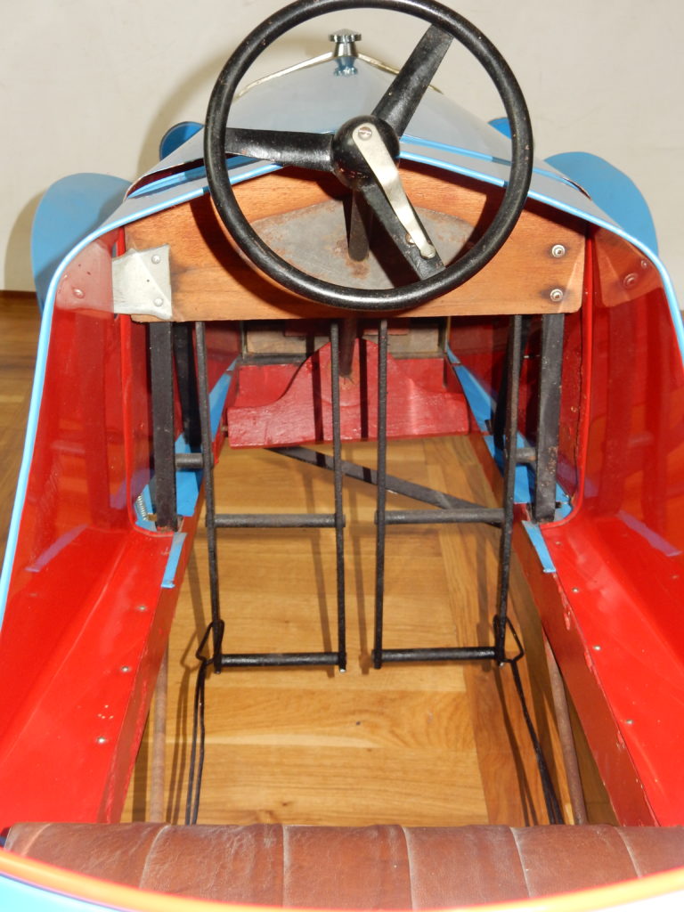 Sonstiges:Dieses schöne Auto ist mit sogenannten "Schmetterlings"- Flügeln ausgestattet. Es verfügt über einen ausgeklügelten Antriebs- mechanismus, bestehend aus zwei horizontal beweglichen Pedalen, die über Zugstangen und Ketten mit Doppelrollen die Hinterachse mit Rädern und Ratschen antreibt. Somit kann man über den Bremshebel die Fahrtrichtung ändern und die Bremse betätigen. Die Bauteile wie Ratschen und Kettenräder sind in einer Sintergusslegierung ausgeführt. Diese werden mit den Jahren stark porös und zerfallen. Bei diesem Exemplar wurde bei einer früheren Restaurierung der Antrieb deshalb umgebaut.