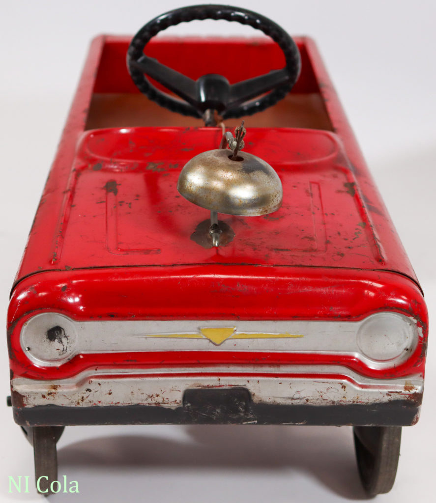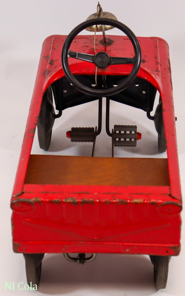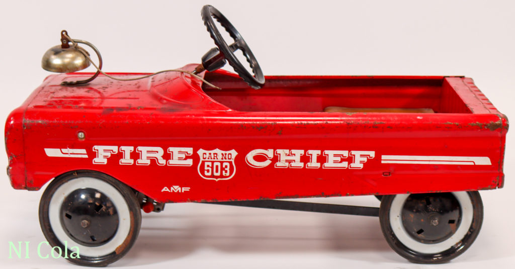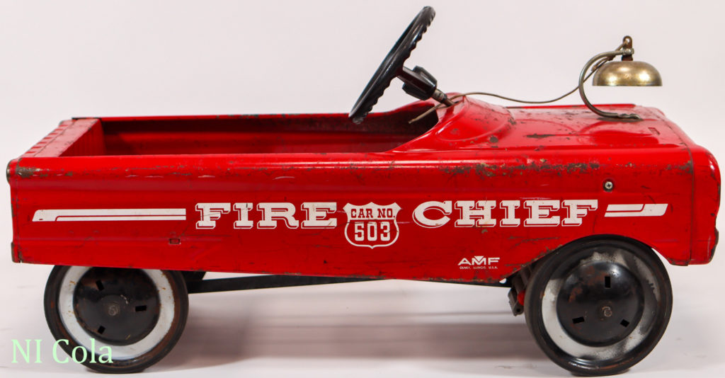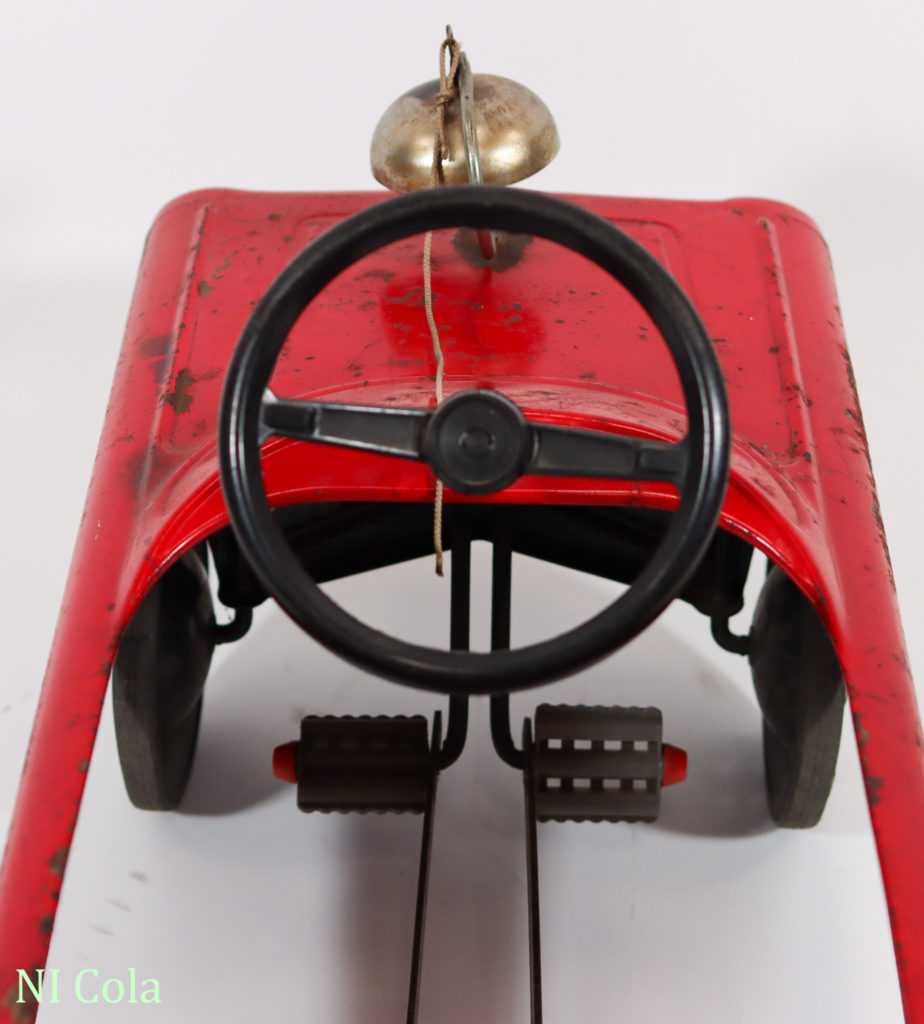 Fire Chief Hersteller:AMF Inc. of Olney Modellname:Fire Chief No 503 Inventarnummer:0020 Ort:Illinois Land:USA Zeit/Epoche:um 1960-80 Länge:88 cm Breite:38 cm Karosserie:Stahlblech, lackiert Antrieb:Tretmechanismus Zustand:Originalzustand Ausstattung:Glocke