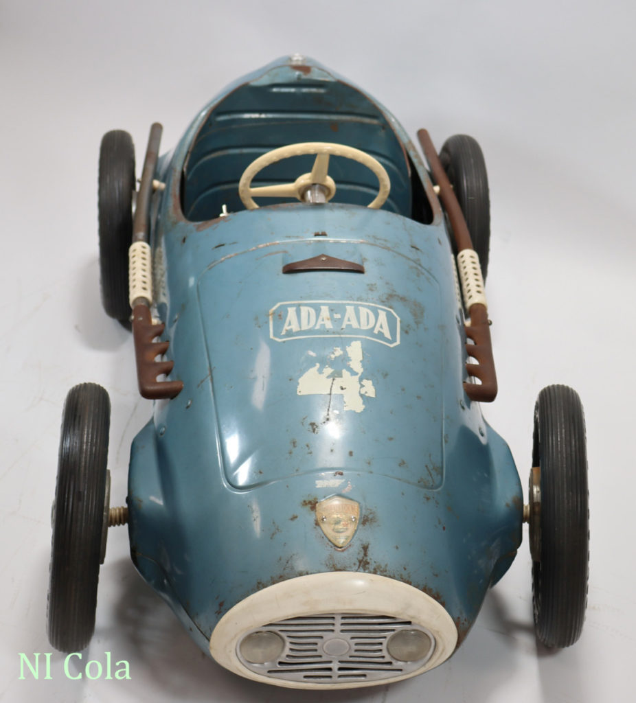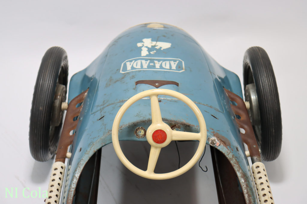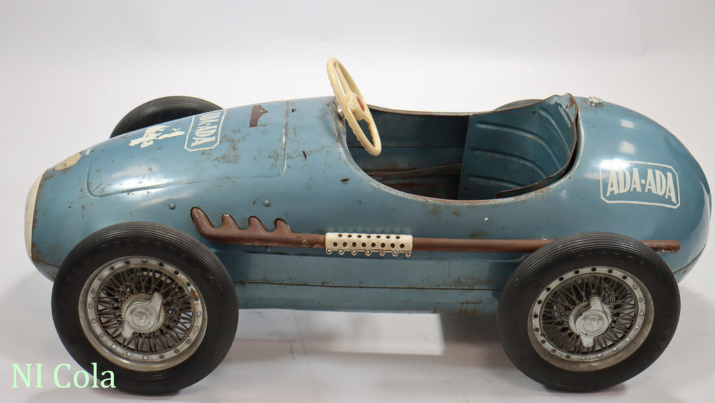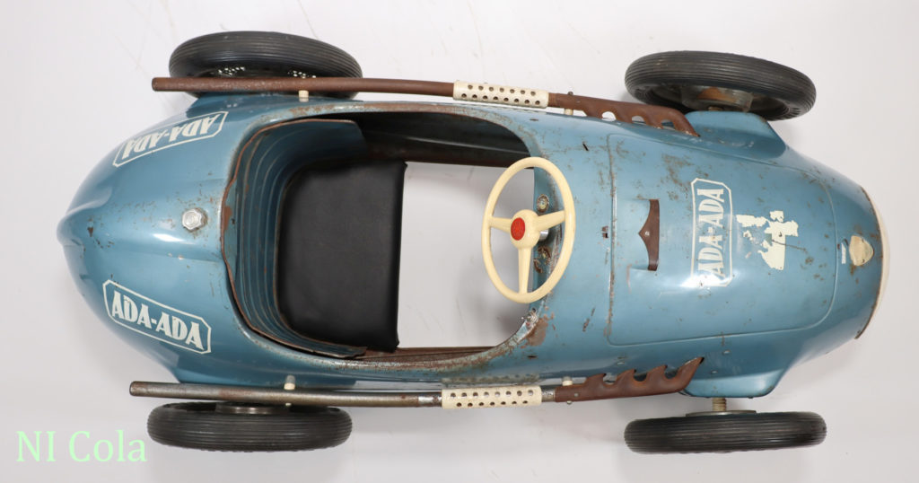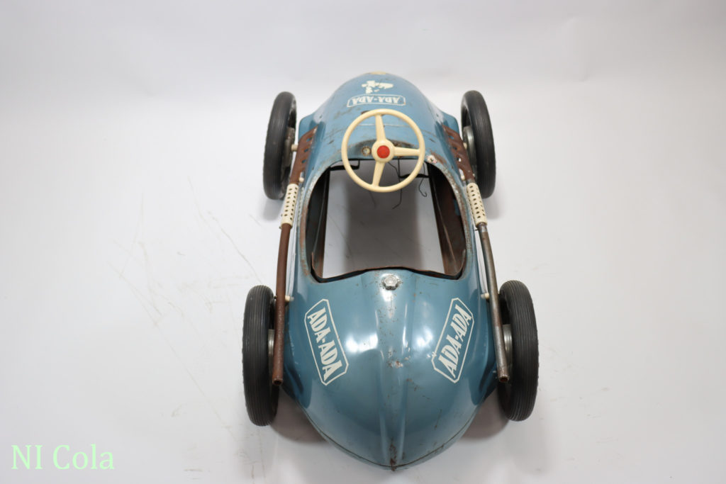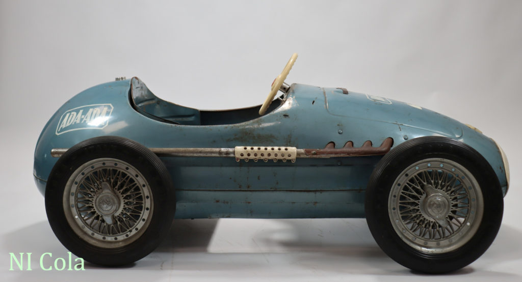 Tretauto – Indianapolis Hersteller:Giordani Modellname:Indianapolis Inventarnummer:0014 Ort:Bologna Land:Italien Zeit/Epoche:um 1955 Länge:131 cm Breite:63 cm Karosserie:Stahlblech, lackiert Fahrgestell:Stahl Antrieb:Tretmechanismus Zustand:Originalzustand Ausstattung:Scheinwerfer und Hupe elektrisch ( 2 x 4,5 V Batterie)