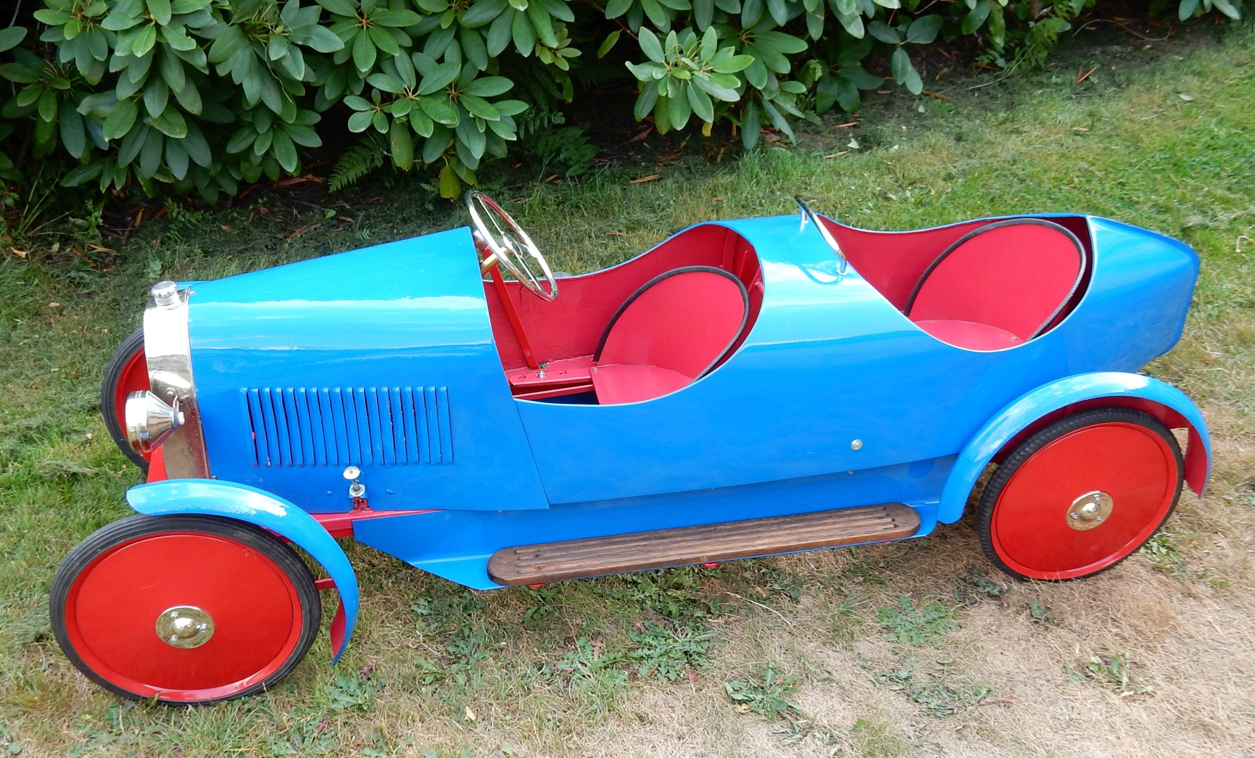 Die Firma EUREKA ist nicht nur in Frankreich, sondern auch in Europa einer der besten Hersteller für Kinderfahrzeuge. Sie brachten fast jedes Jahr von 1922-1967 einen neuen Typ heraus. Die ersten Modelle fanden einen starken Bezug zu Bugatti. Das ist bei diesem im Bugatti Stil gebauten Zweisitzer auch der Fall. Dieses Tretauto ist wie jeder Zweisitzer sehr teuer und absolut selten. Privat wurde so ein Fahrzeug wenig gekauft, aber umso mehr von Schaustellern. So wurden z. B. an der Atlantikküste in den großen Badeorten Holzbahnen für Kinderautos aufgestellt und die Eltern konnten für ihre Kinder diese Autos stundenweise mieten. Der große Nachteil für die Autos war die Unterbringung auch außerhalb der Badesaison in Holzbaracken in Strandnähe. Das Salzwasser der Luft hat den Rostprozess der Fahrzeuge verstärkt. Aus diesem Grund haben wenige überlebt. Eines dieser Kinderautos durfte ich dann in der Nähe von Lyon abholen. Es bot sich mir als große Herausforderung an.