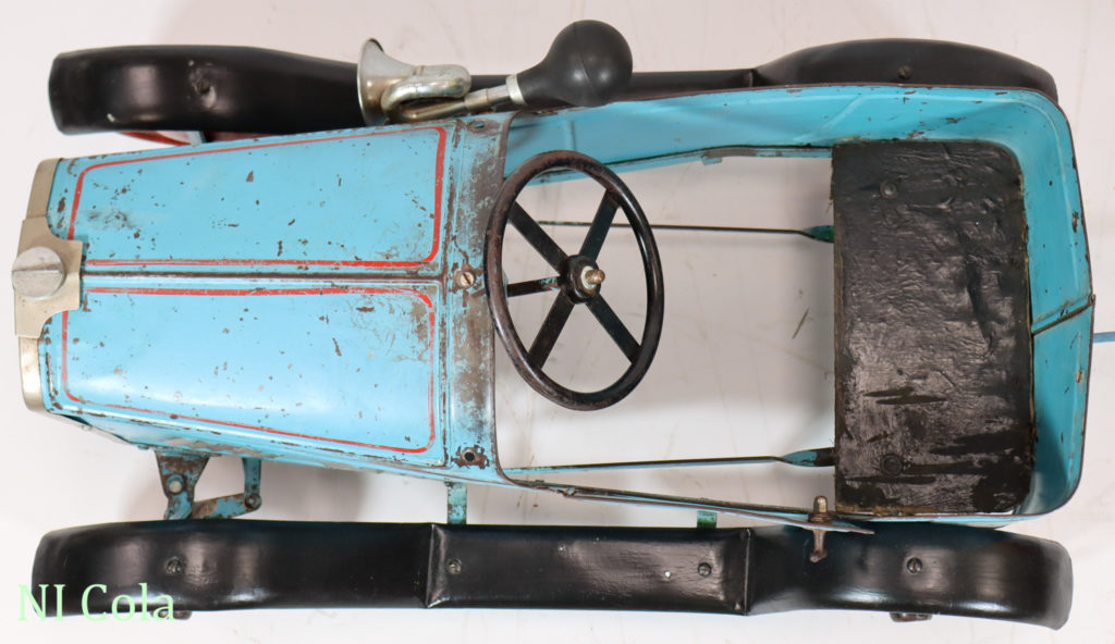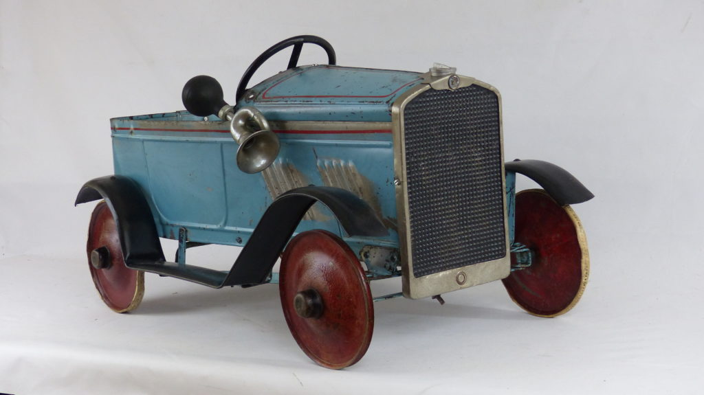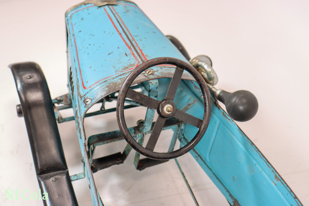 Anfang 2018 konnte ich das Tretauto mit der gesamten Historie übernehmen. Das Fahrzeug wurde beim letzten Besitzer in England noch einmal grün überstrichen. Diese Übermalung konnte ich entfernen und den Originalzustand somit wieder herstellen.