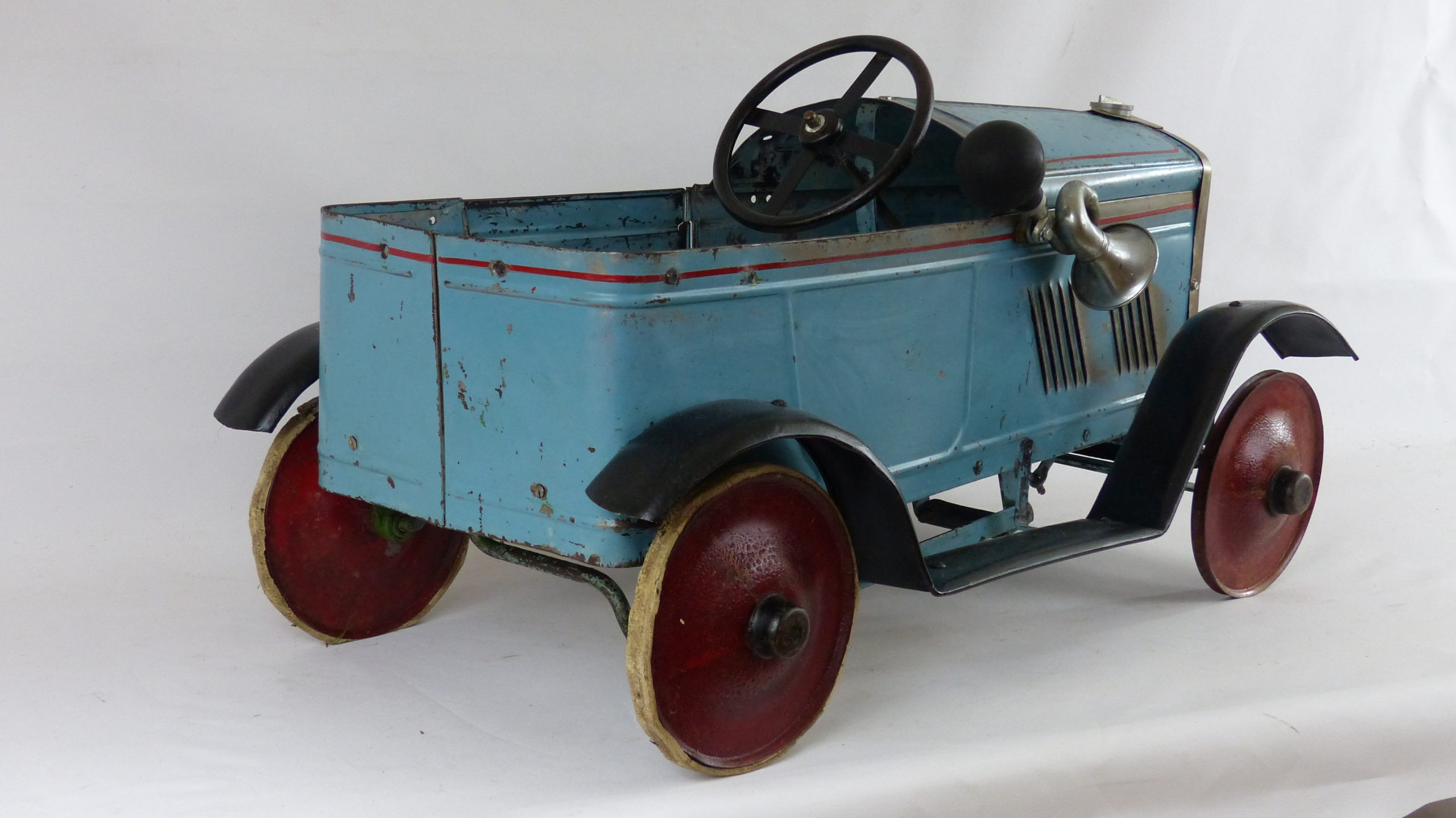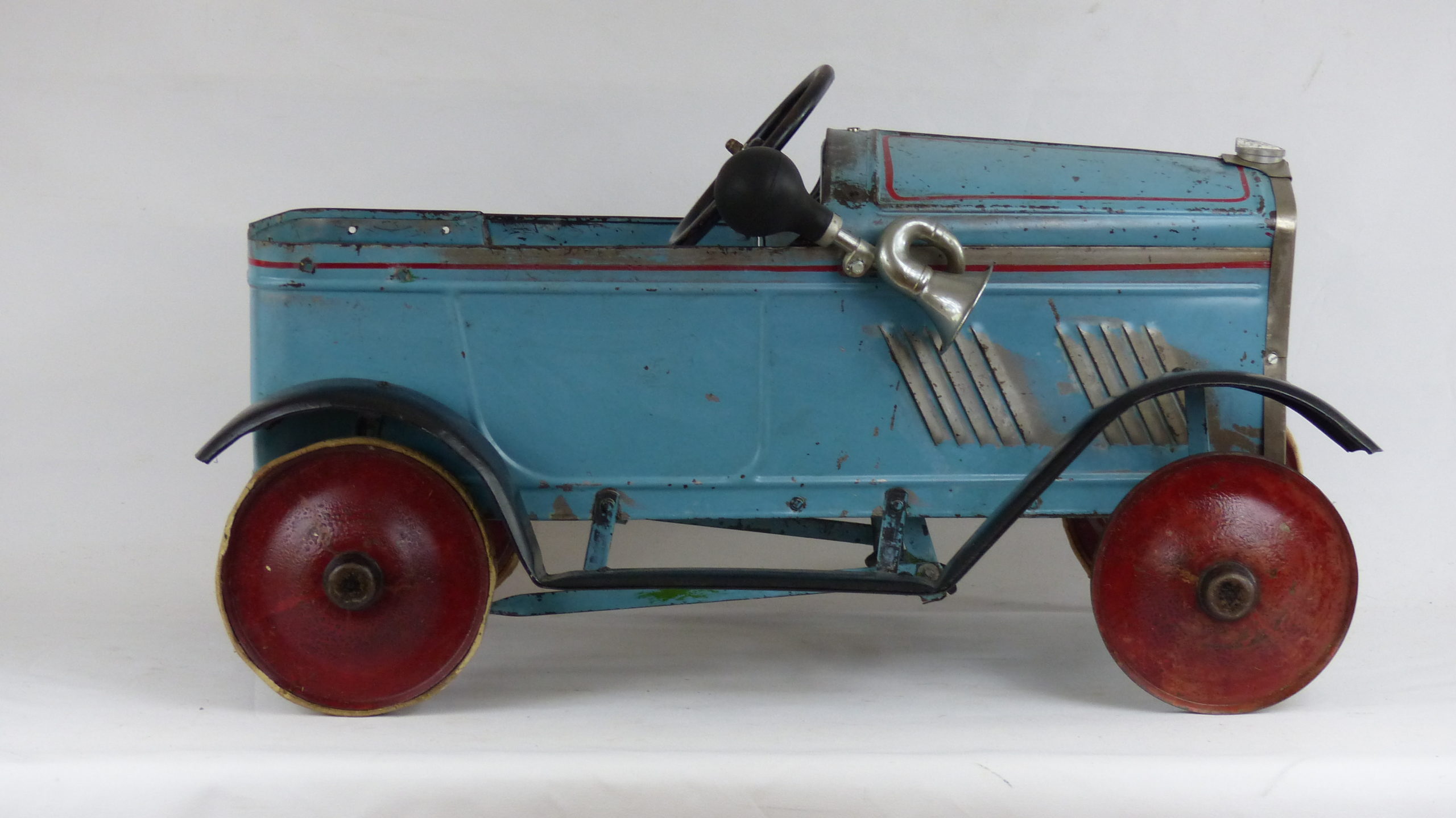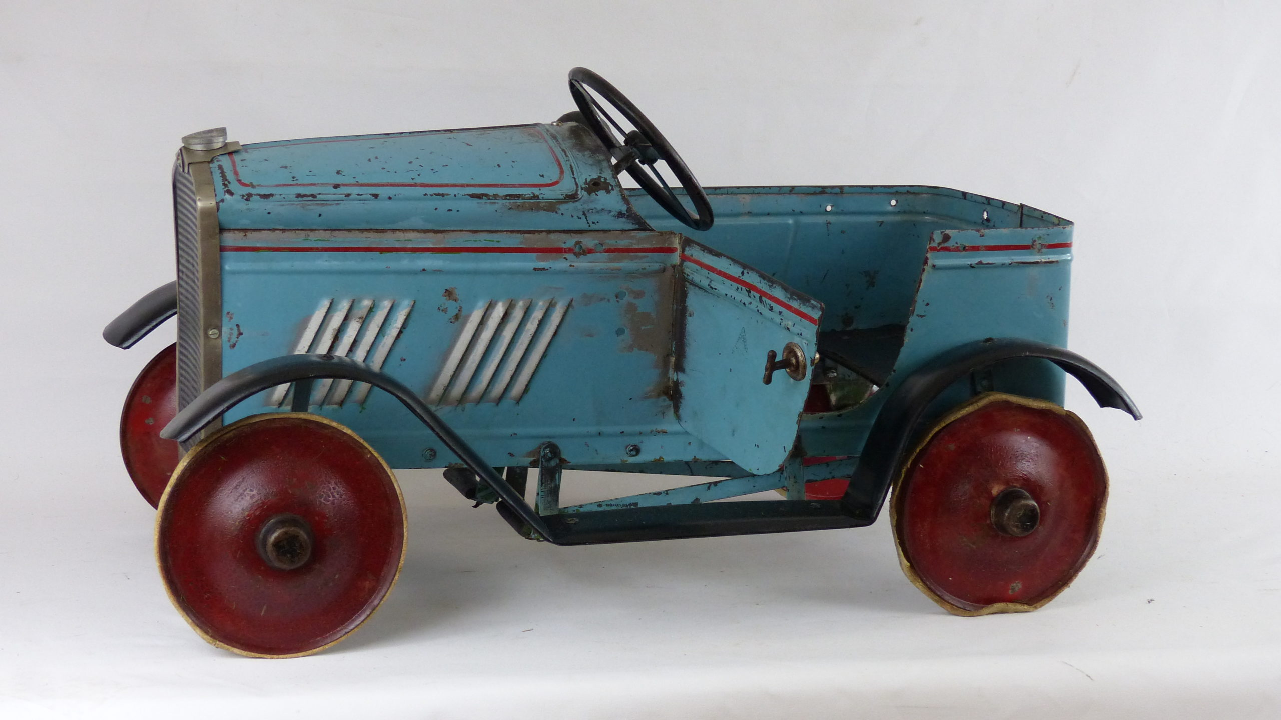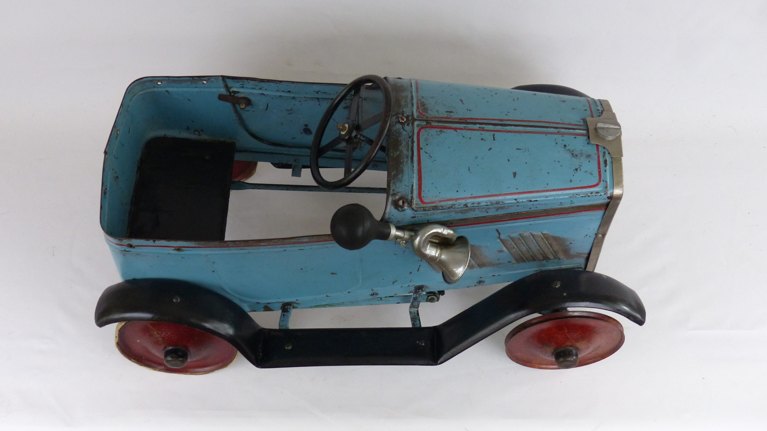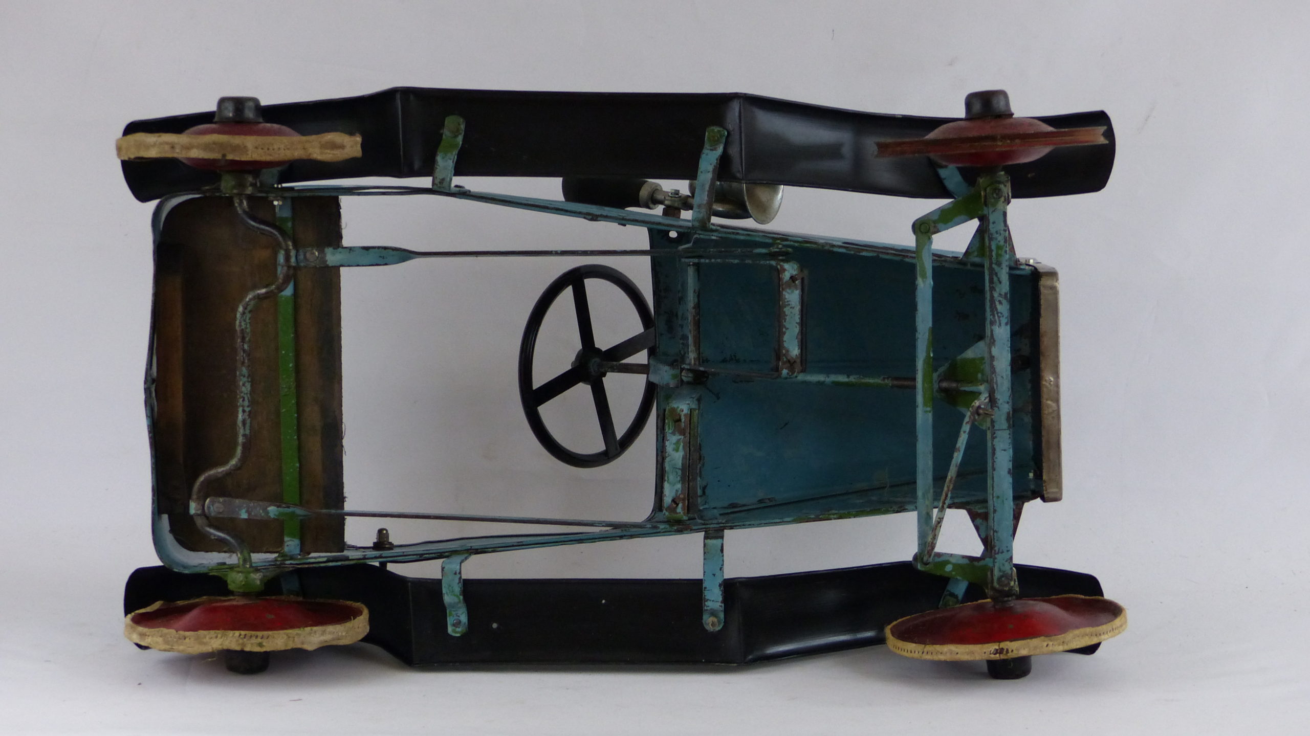 Anfang 2018 konnte ich das Tretauto mit der gesamten Historie übernehmen. Das Fahrzeug wurde beim letzten Besitzer in England noch einmal grün überstrichen. Diese Übermalung konnte ich entfernen und den Originalzustand somit wieder herstellen.